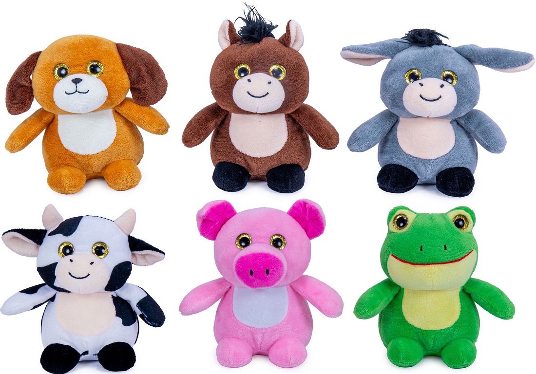 Plüsch Farmtiere sitzend mit GlitzerAugen 6/s ca. 14cm (Hund, Pferd, Esel, Kuh, Schwein, Frosch)
