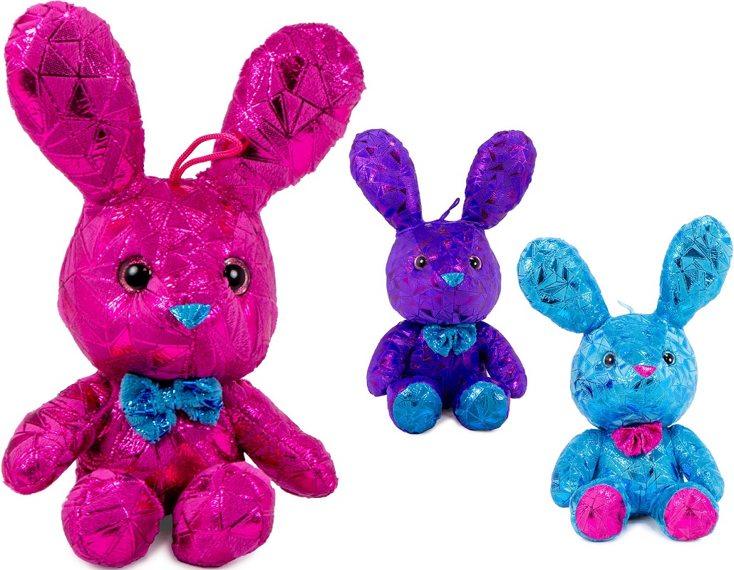 Plüsch Hase sitzend aus glänzendem Stoff mit GlitzerAugen & Schleife 3/s ca. 22cm (Pink, Lila, Blau)