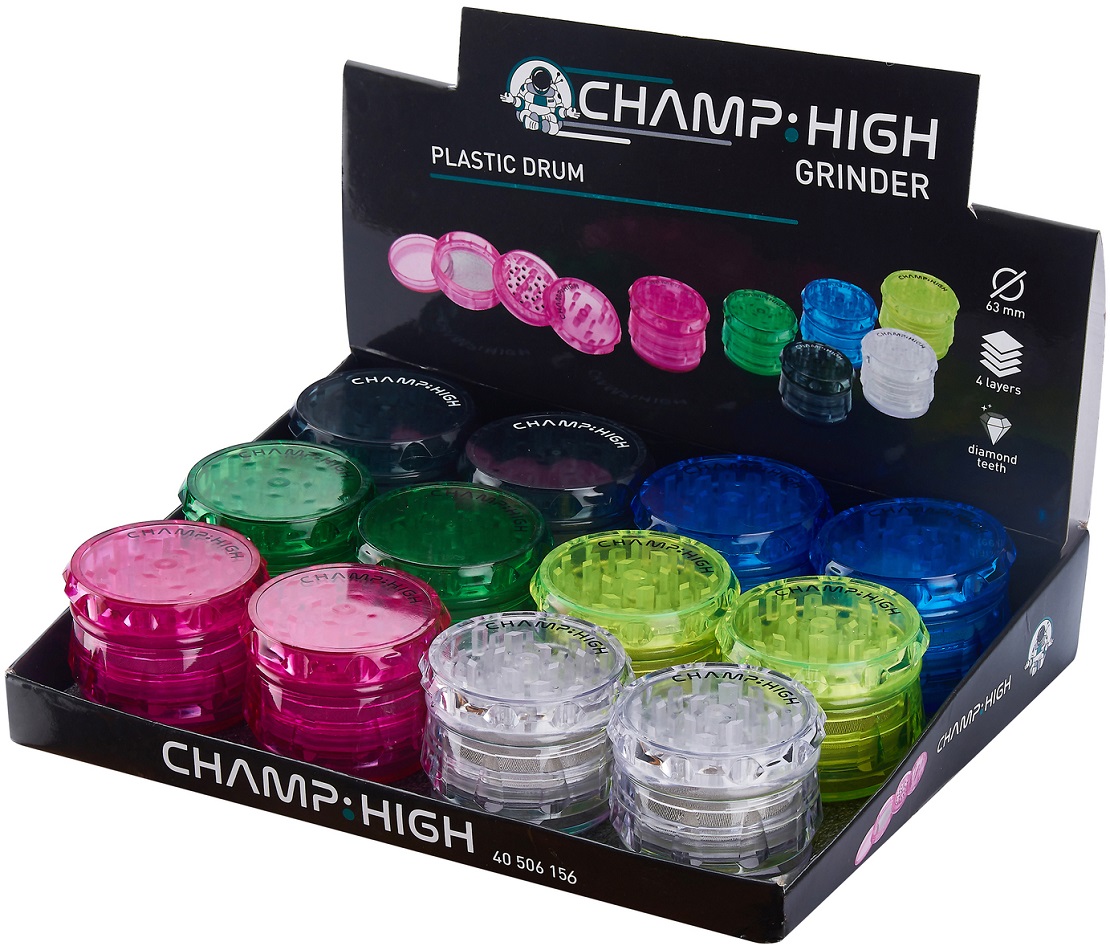 Kunststoff Grinder Transparent Champ High ca. Ø 63mm 4tlg. in 12er T-Dsp. (Schwarz, Blau, Grün, Gelb, Pink, Weiß)