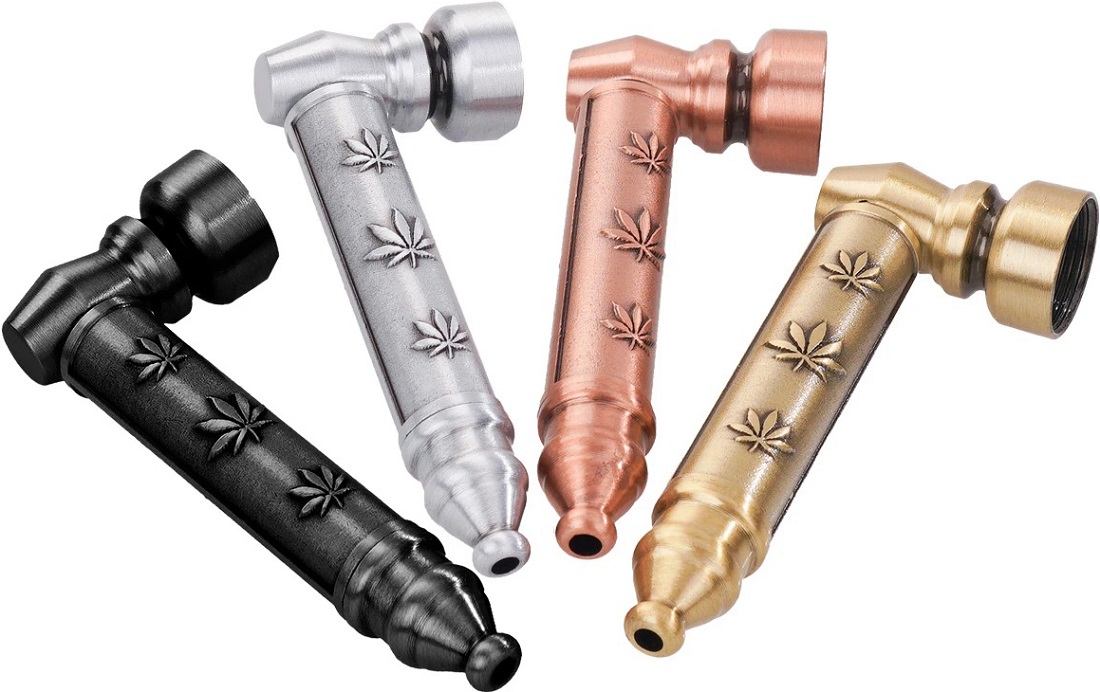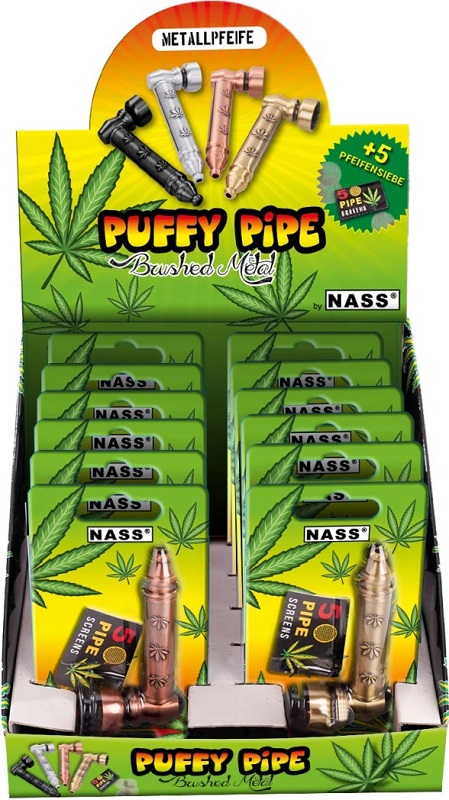 Tabak-Pfeife Puffy Pipe Brushed Metal mit Leaves Motiven & mit je 5 Ersatz-Sieben im 12er T-Dsp.
