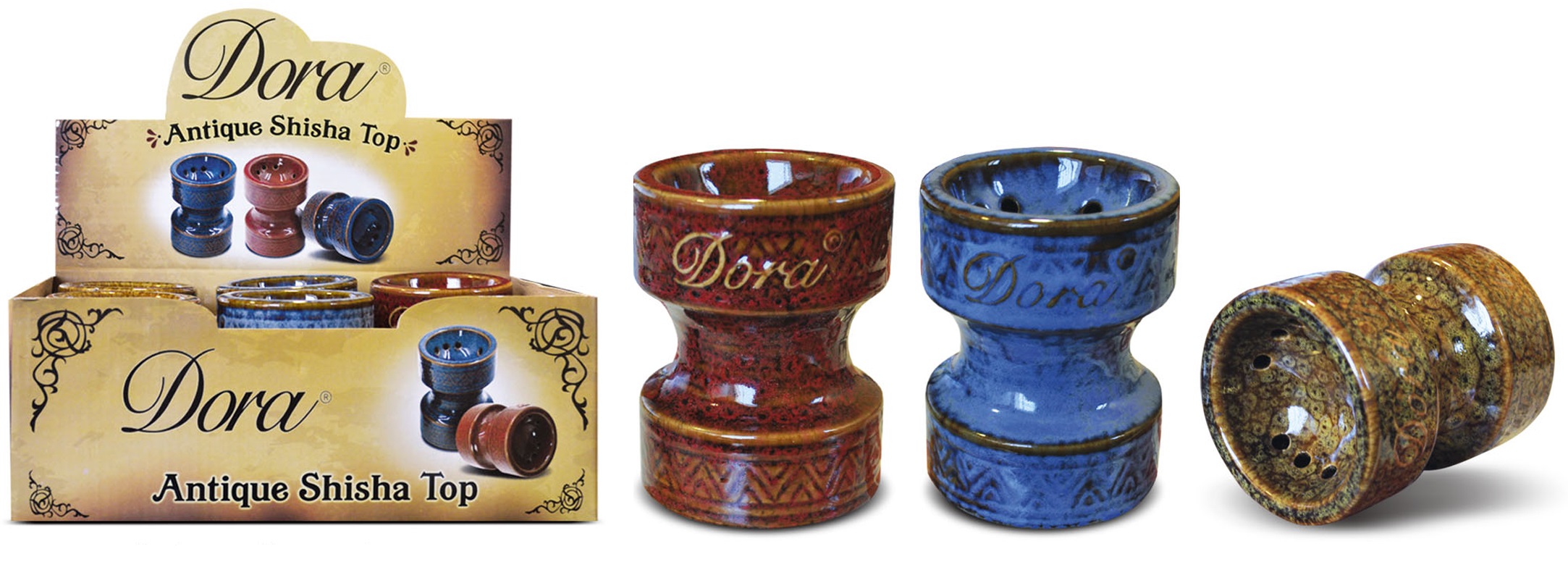 Shisha Kopf "Dora" aus Keramik 3/s in 6er T-Dsp. Ø 7cm (braun, blau, kupfer-farbend)