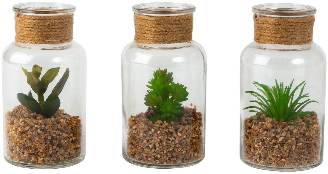 Deko Glas-Flasche mit künstlichem Kaktus in kleinen Steinchen ca. 13 x 7cm 3/s