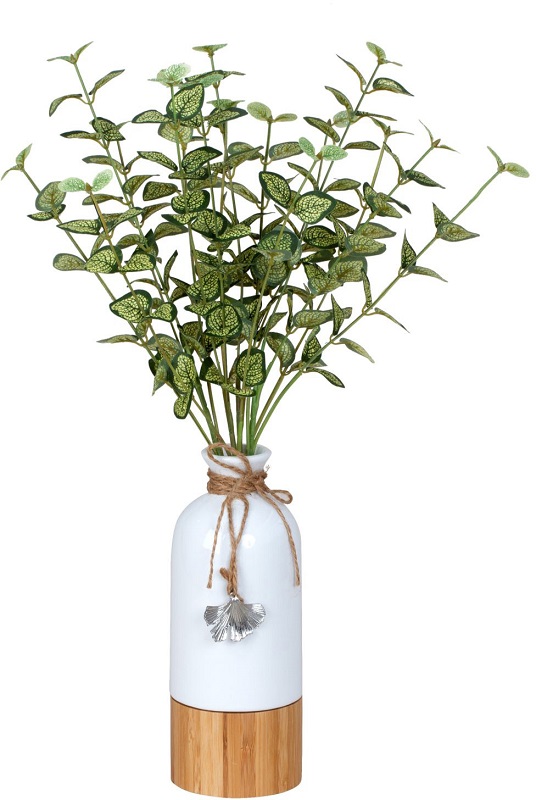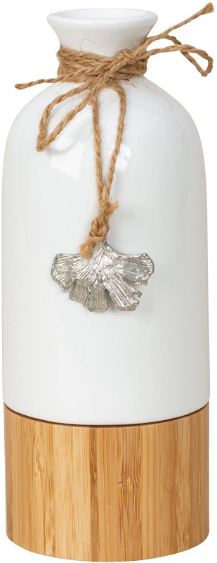 Deko Porzellan Vase mit Holzboden & silbernen Blatt-Anhänger ca. 21cm Ø 8cm