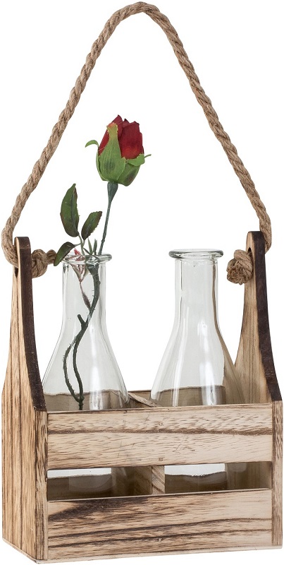 Glasvasen in Holzgestell mit Kordel im Vintagelook ca. 20,5 x 16cm