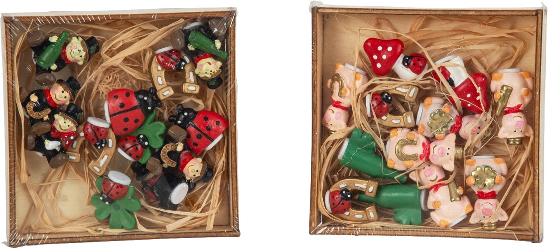 Glücksbringer Mix aus Polyresin ca. 2-3,5cm mit Klebepunkt 2/s in 12er Holzbox (