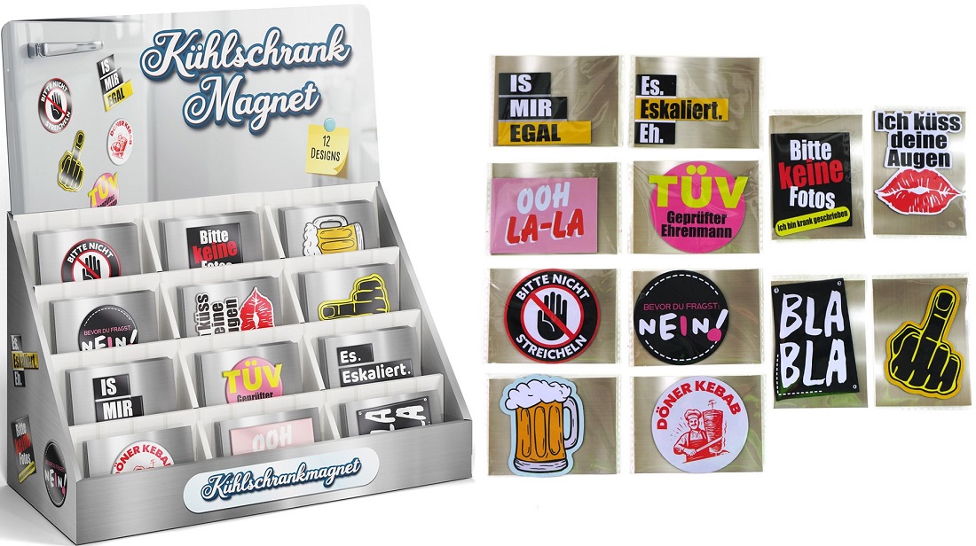 Kühlschrankmagneten mit lustigen Sprüchen / Designs ca. 8 x 7cm 12/s im 72er T-Dsp.