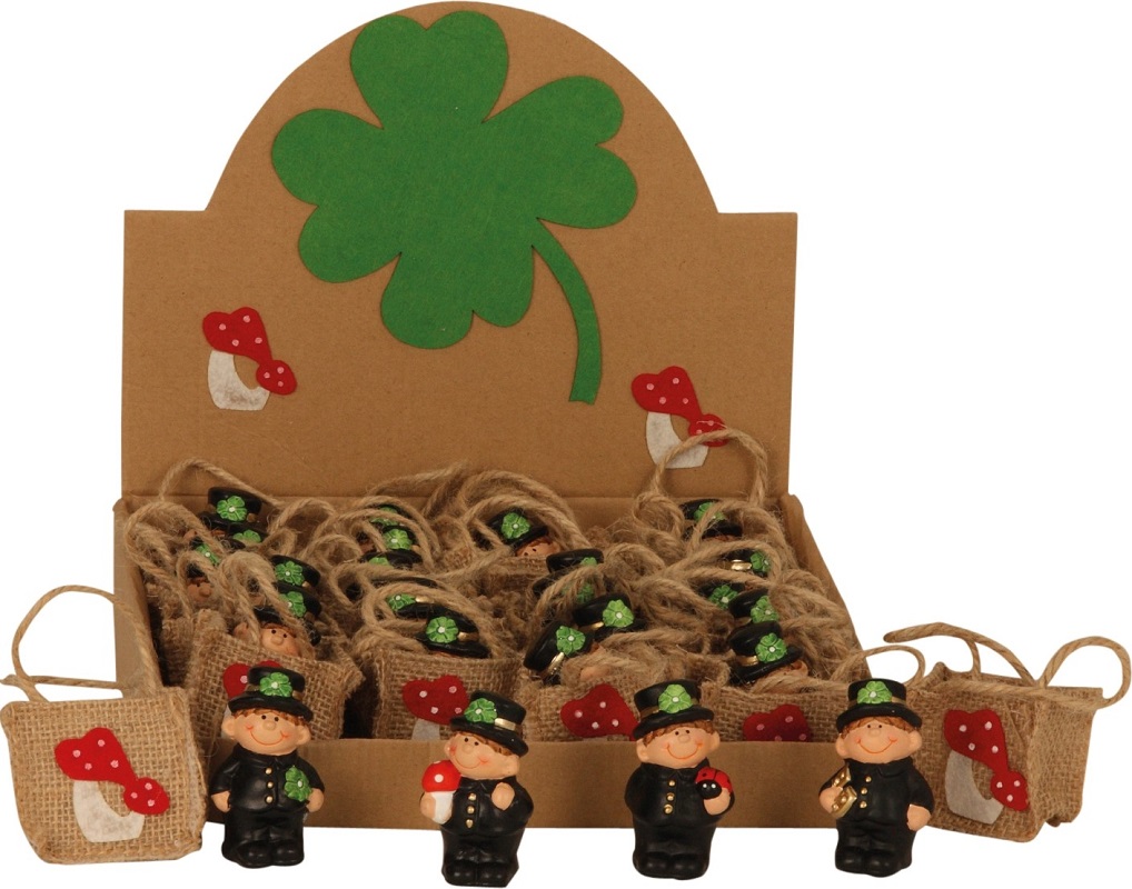 Schornsteinfeger Glücksbringer aus Keramik im Beutelchen ca. 7 x 3,8cm 4/s im 24er Dsp. (mit Kleeblatt, -Pilz, -Marienkäfer, -Hufeisen)