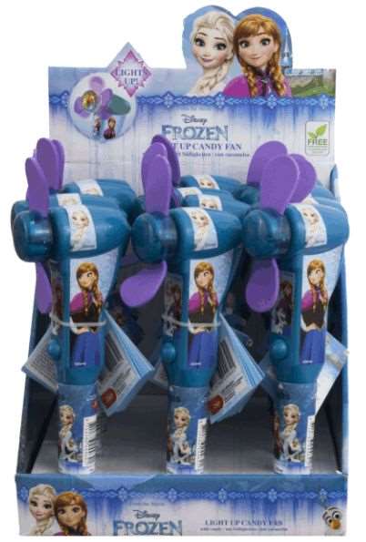 VE:12 Frozen Light Up Candy Fan(Handventilator) mit Zuckergragees&Licht Batt.inkls. ca. 18,5cm im Dsp.