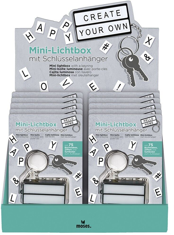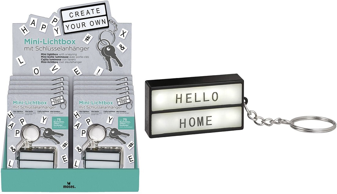 Mini-Lichtbox Schlüsselanhänger inkl. 75 Buchstaben, Ziffern und Symbolen im 12er T-Dsp.