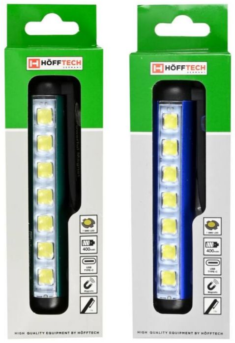 LED Taschelampe Höfftech Wiederaufladbar kompakt mit Magnetclip 7x SMD + LED Batterie: 14500 Lithium / 400 mAh mit Typ-C-Kabel 4 Modi ca.11cm Einzelbox 24er T-Dsp.