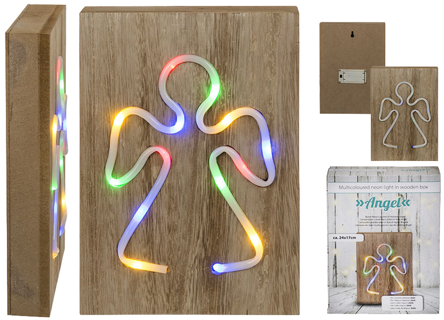 Bunte Neon-Leuchte, Engel, auf Holzbox ca. 24 x 17 cm, für 2 Mignon Batterien (AAA) in Geschenkbox