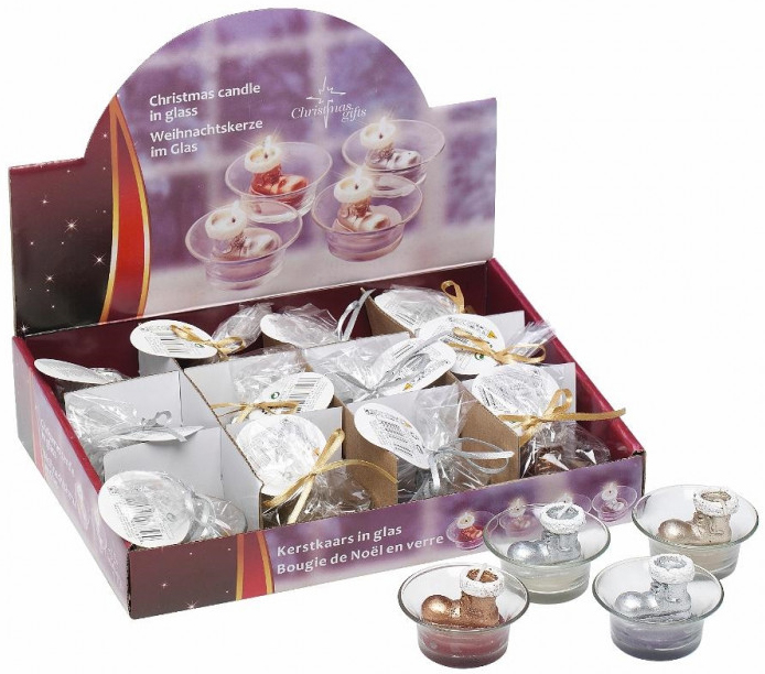Weihnachtskerze in Stiefelform 4/s im Glas in 12er T-Dsp.