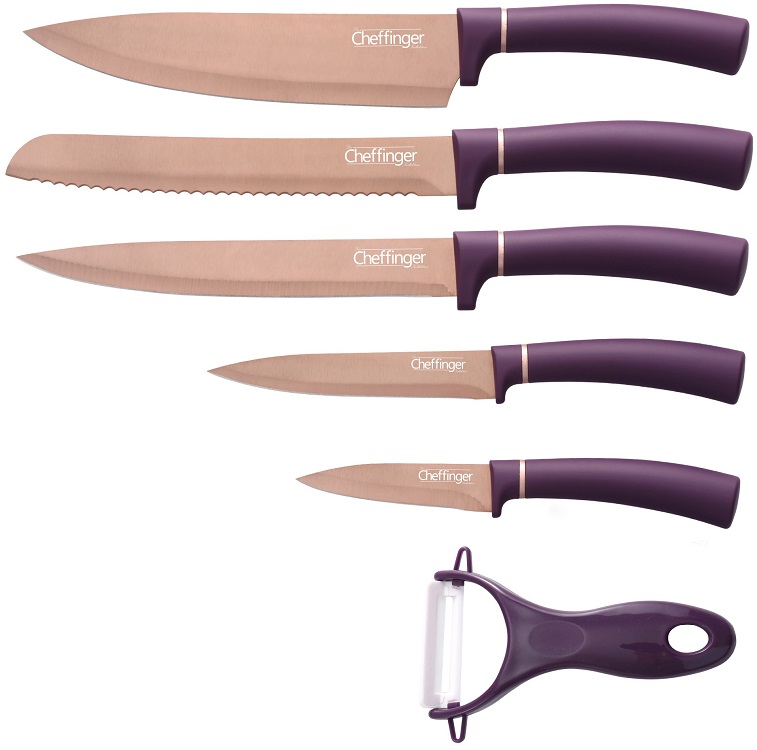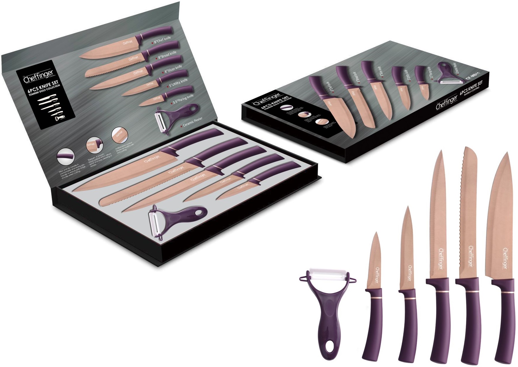 Messerset lila/gold Cheffinger 6 tlg. in Magnetic Box mit Kochmesser, Brotmesser, Universalmesser, Schälmesser und Keramik Schäler