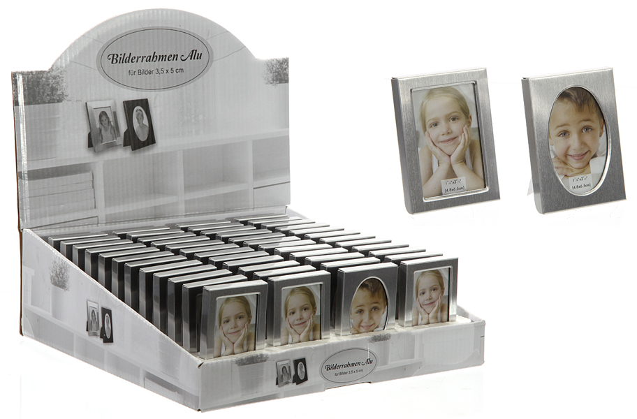 Bilderrahmen 2f/s f. Bilder 3,5x5 cm Rahmen: 5x6,5x1 cm; Material: Alu, silber 48er T-Dsp.