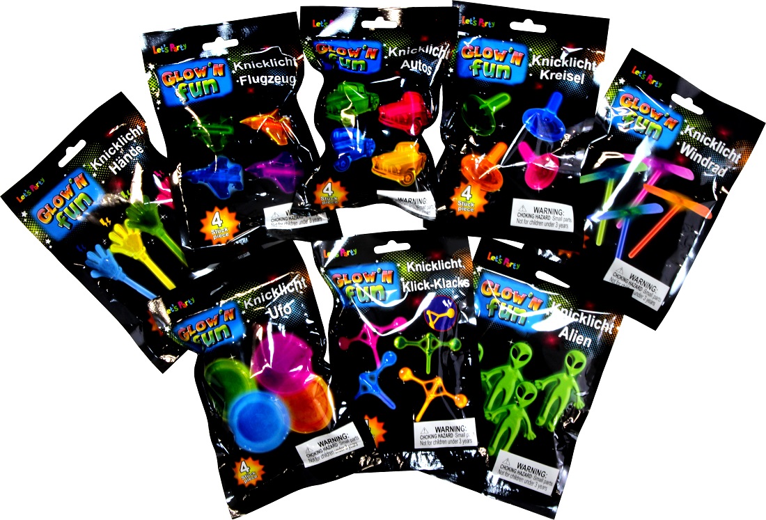Knicklicht-Sortiment, 8-fach sortiert (Hände, Flugzeug, Autos, Kreisel, Windrad, Ufo, Klick-Klacks, Alien)