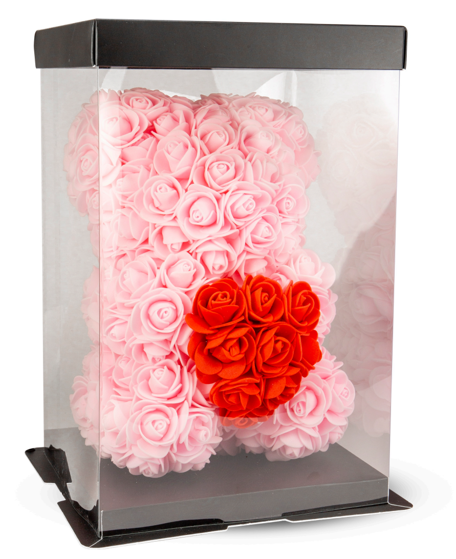 Rosen Teddy/Bär ROSA mit HERZ in Rot inkl.PVC BOX&Schleife für SELBERAUFBAU! ca.25 cm aus PE Blumen&Schaum stoff.