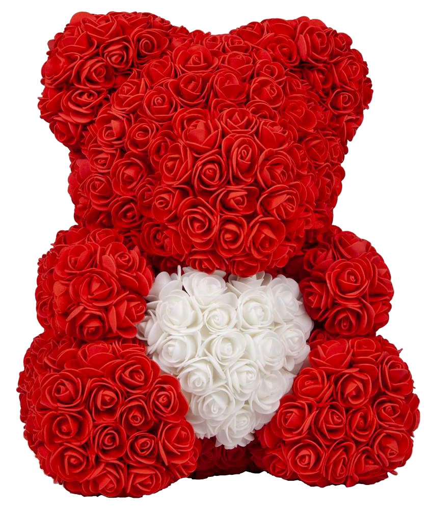 Rosen Teddy/Bär ROT mit HERZ in Weiß inkl.PVC BOX&Schleife für SELBERAUFBAU! ca.25 cm aus PE Blumen&Schaum stoff.