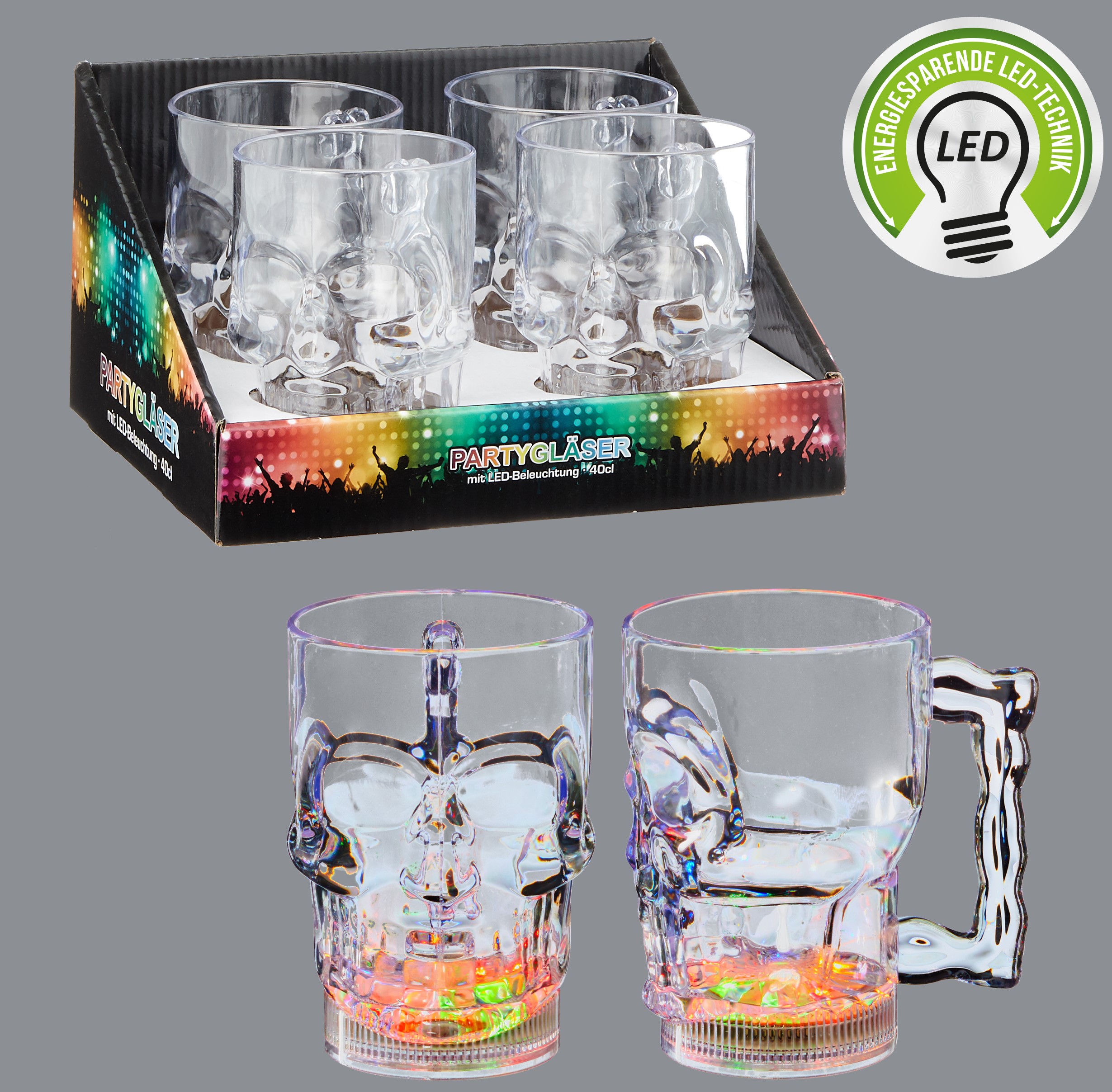 LED Partyglas "Skull/Totenkopf" ca. 400ml inkl. 3xLR44 Betterien in 4er T-Dsp.