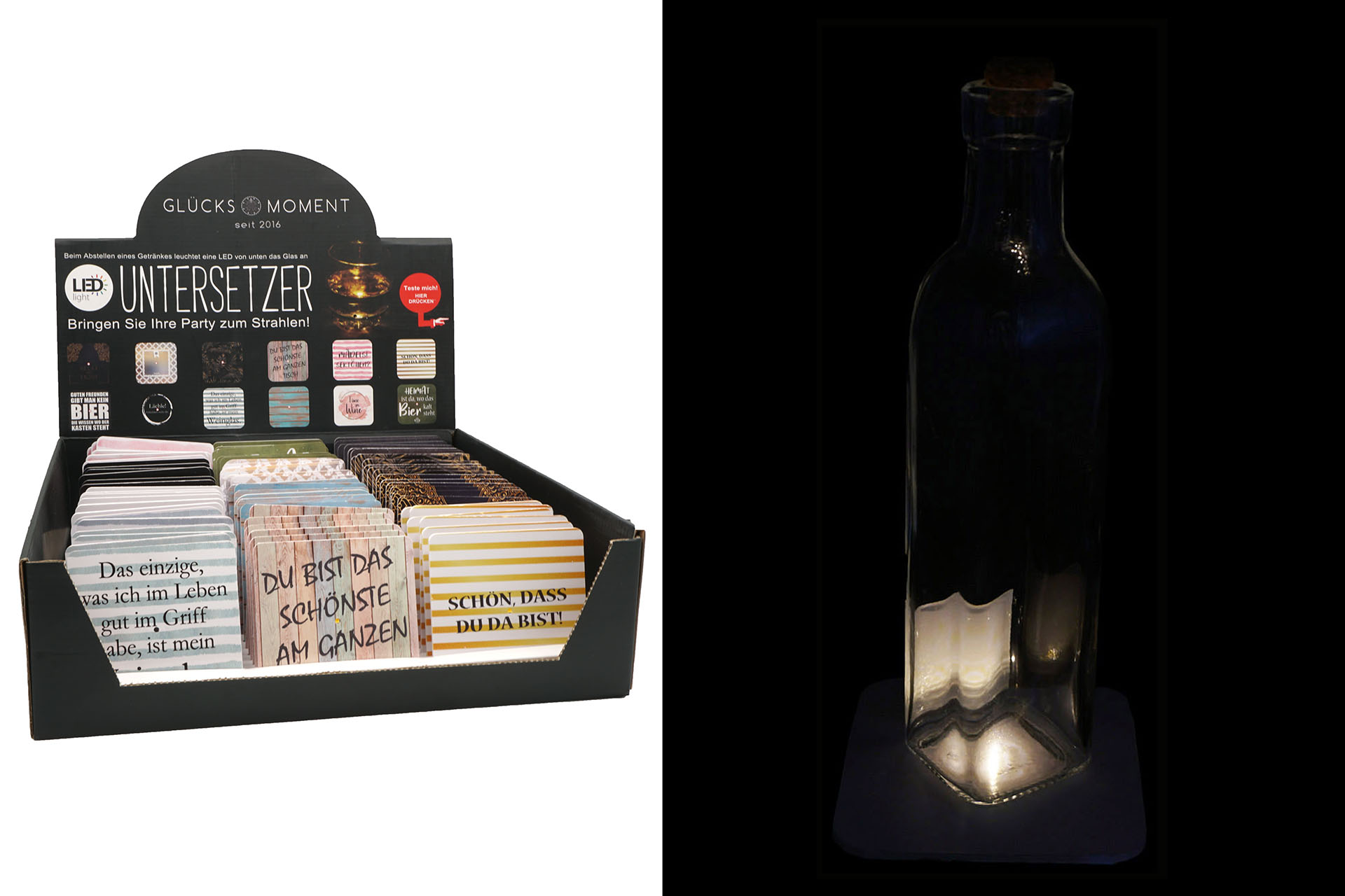 Untersetzer LED mit Spruch ca. 9,5 x 9,5cm 12/s in 72er T-Dsp.