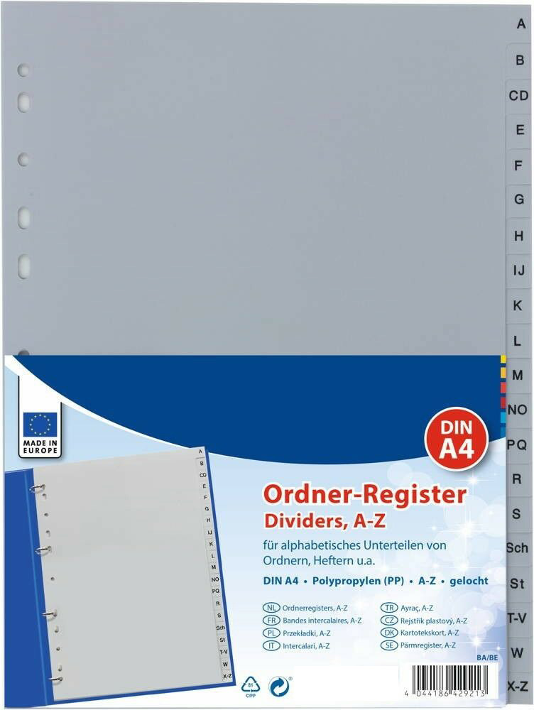 Ordner Register DIN A4 von A-Z aus PP grau Folienstiften beschreibbar