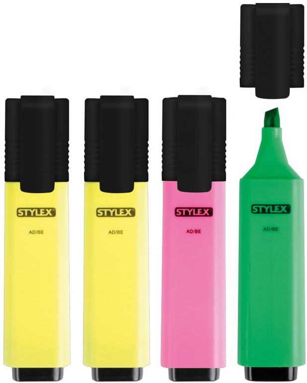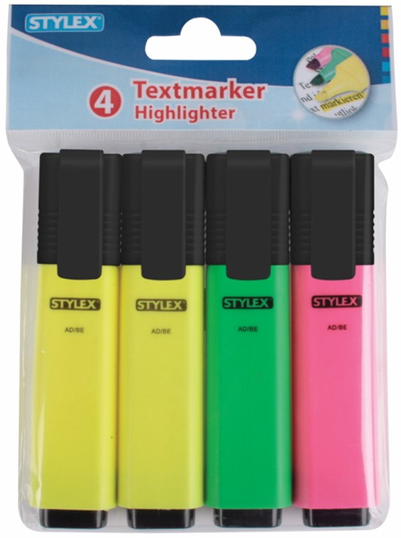 Stylex Textmarker mit Clip in 4er Verpackung mit Headerkarte 3/s (2x gelb, pink, grün)