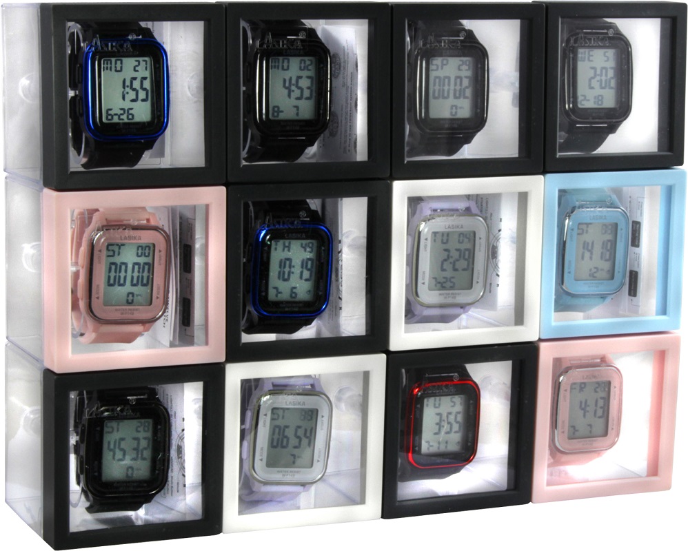 Digitale Armbanduhr 40mm mit Silikon Sportarmband 6/s 3 Bar Water Resistant im 12er T-Dsp. (4x Schwarz, 2x Schwarz/Blau, 1x Schwarz/Rot, 2x Violett, 1x Blau, 2x Pink)