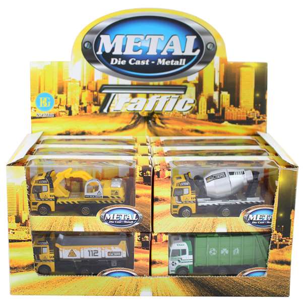 VE:12 Metall LKW Baufahrzeuge 4-fach sort. ca. 11cm im Sichtboy/Dsp