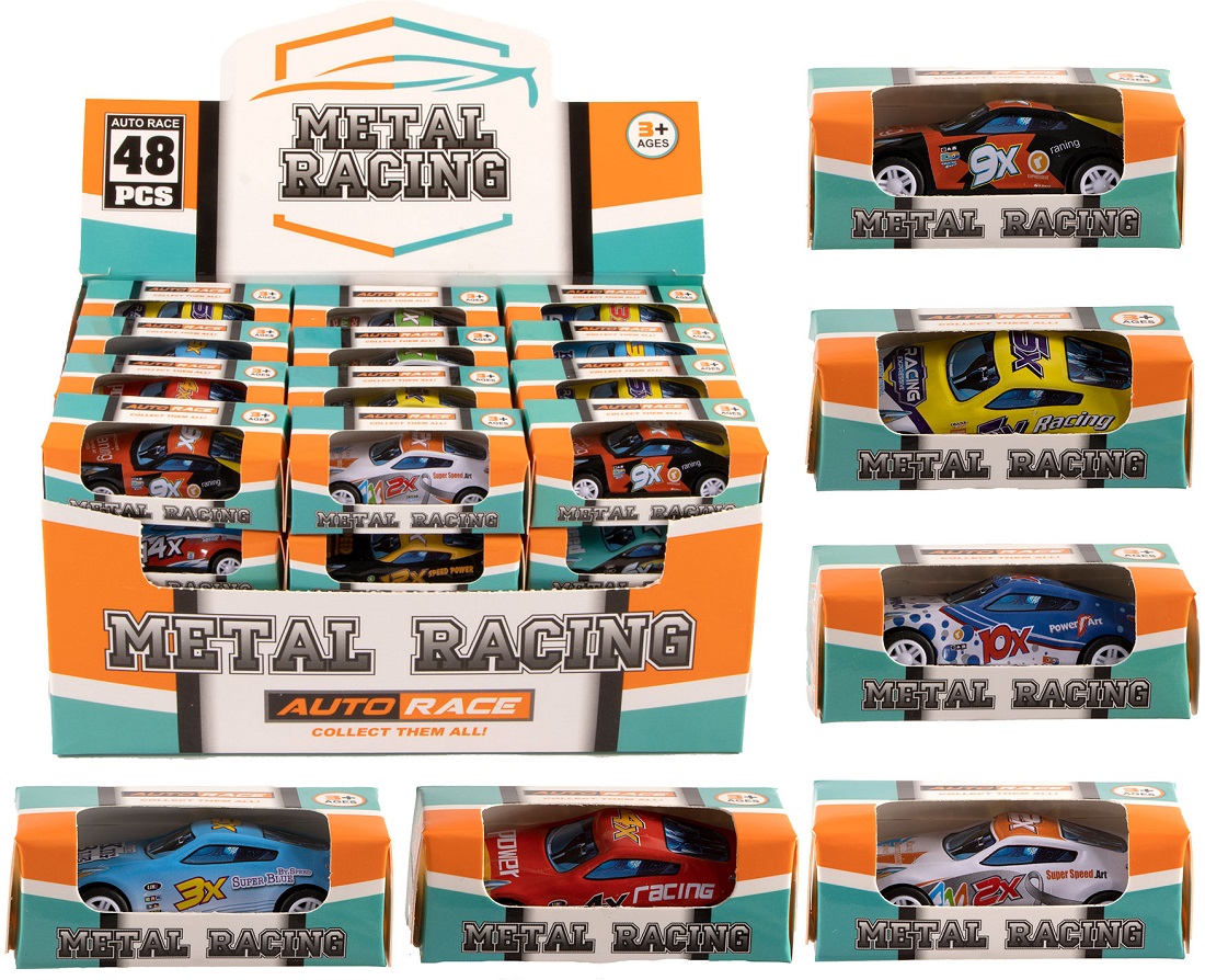 Spielzeug Autos Metal Cars Rennautos ca. 6,5cm 6/s (Schwarz/orange, Gelb, Blau/Weiß, Weiß/Orange, Rot, Blau) Einzelbox im 48er T-Dsp.