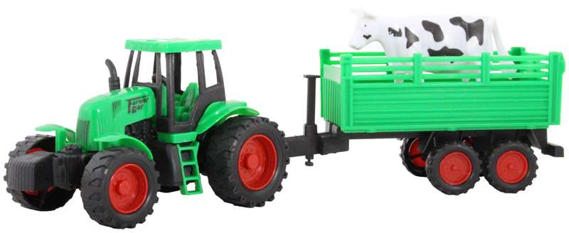 Traktor mit Anhänger+Kuh Friktionmotor ca.27cm in Sichtbox