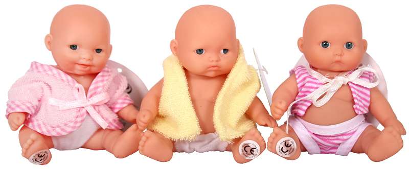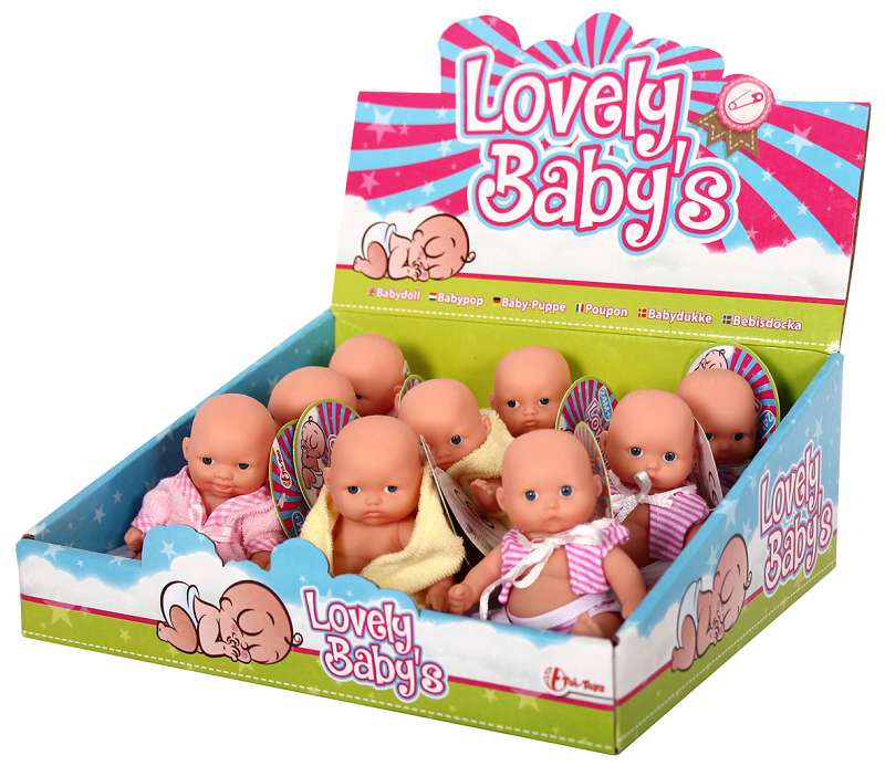 VE:9 Baby Puppen im Display, 3-fach sort., ca. 8,5cm x 7,5cm sitzend im Dsp.