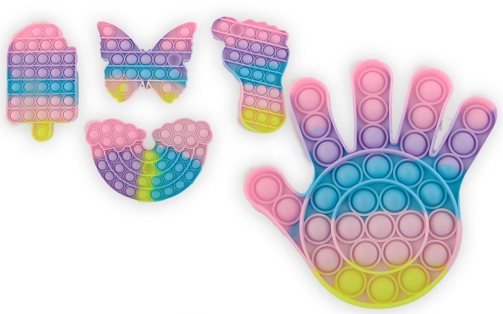 Anti Stress POP IT 15cm 6/f (Eis, Schmetterling, Fuß, Regenbogen, Hand)