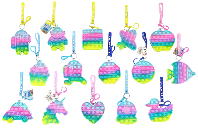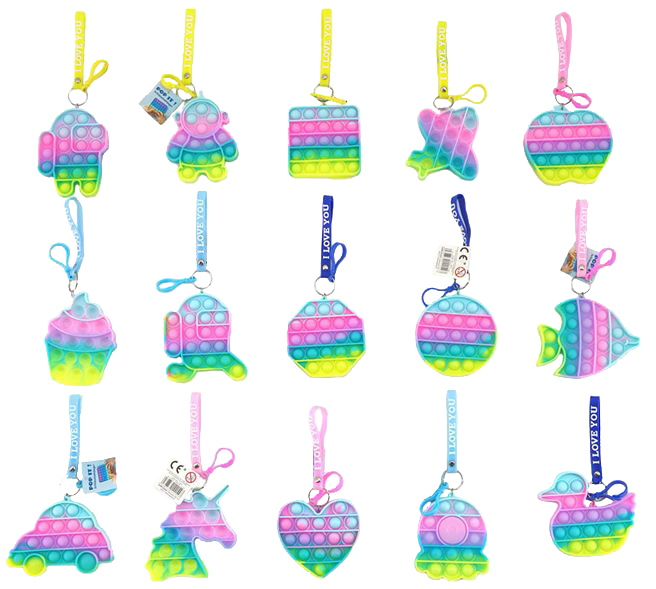 Anti Stress POP IT Schlüsselanhänger mit beschrifteter Gummischlaufe "I LOVE YOU" ca. 10cm 30 Stk. (Roboter, Flugzeug, Apfel, Eis, Fisch, Auto, Herz, Ente, Einhorn, usw.))