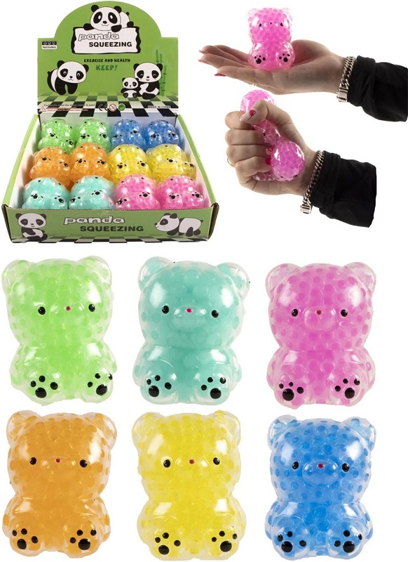 Anti Stress Squeeze Ball Panda transparent mit bunten Perlen zum Quetschen 6/s (Grün, Türkis, Pink, Orange, Gelb, Blau) ca. 8cm im 12er T-Dsp.