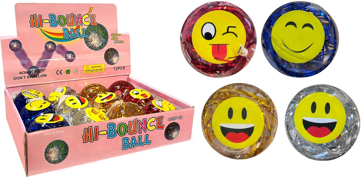 HI-Bounce LED Licht Flummiball mit lustigen Smileys und Glitter ca. 6,5cm 4/s in 12er T-Dsp.
