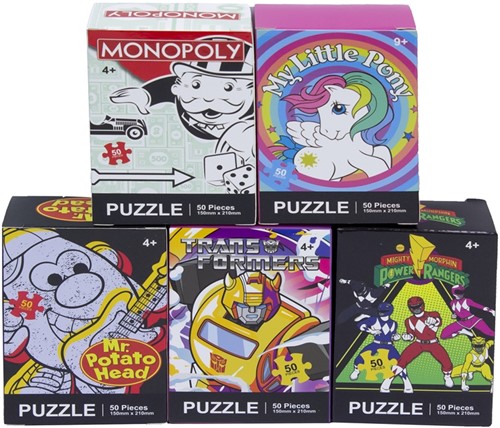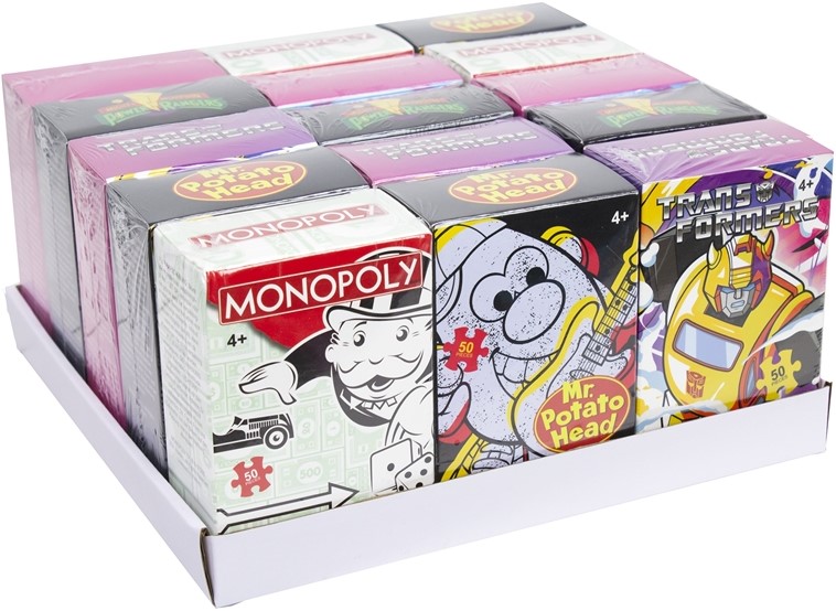 Puzzle 50 tlg. in 12er T-Dsp. 5/s (Transformer, Monopoly, My Little Pony, Power Rangers, Mr. Potato Head)