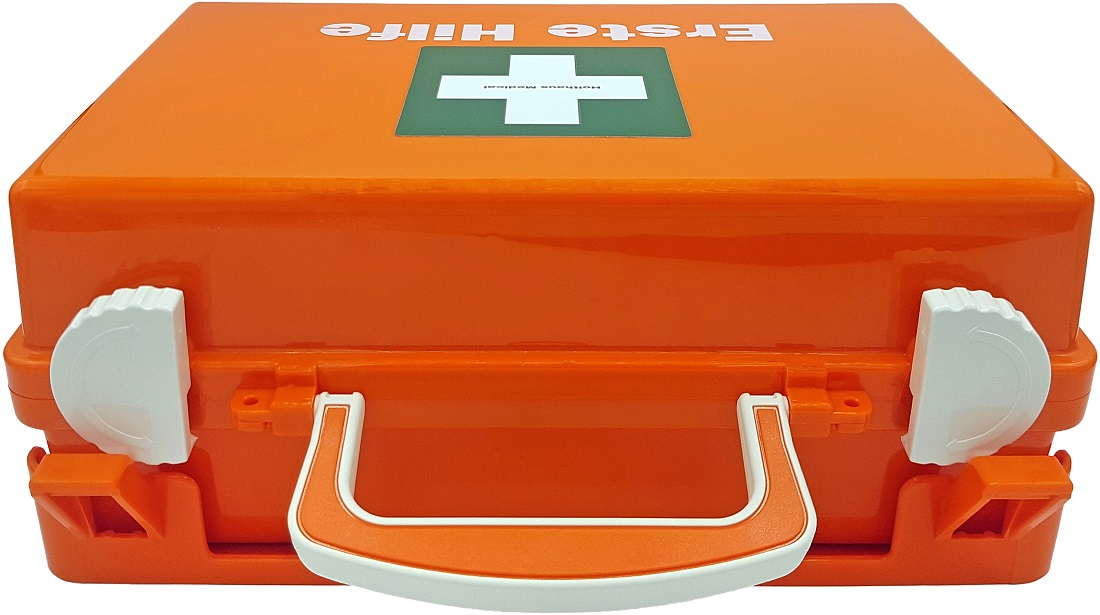 Erste-Hilfe-Koffer QUICK Orange 26x17x11cm Inhalt nach DIN 13157 inkl. Wandhalterung mit 90°-Stop Arretierung