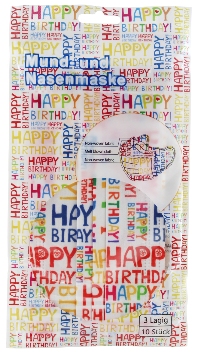Mund Nasen Maske 3-lagig HAPPY BIRTHDAY mit Nasenbügel&Ohrschlaufen Einheitsgröße 10 Stück im Set(10er beutel) im 48x10er T-Dsp.(preis pro stück)