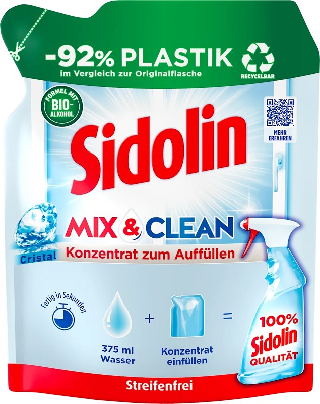 Sidolin Mix&Clean Cristal 125ml Nachfüllbeutel, Konzentrat zum Auffüllen, 375ml Wasser + Konzentrat einfüllen = 100% Sidolin Qualität