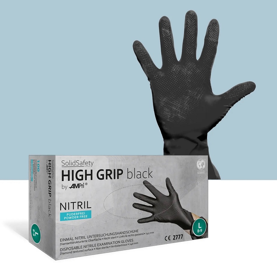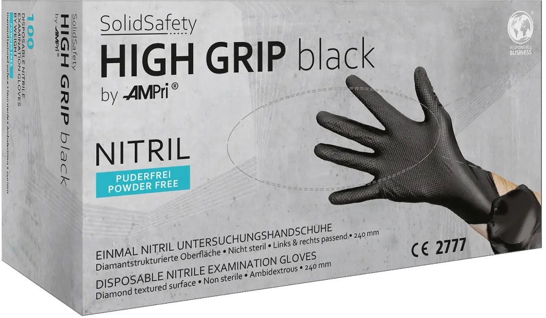 SolidSafety High Grip Nitril-Chemikalienschutzhandschuh Gr.M (Schwarz) puderfei 100er Box (ISO 374-1/Typ B; EN 374-5:2016; EN 420:2010; EN 455; EN 455-1)