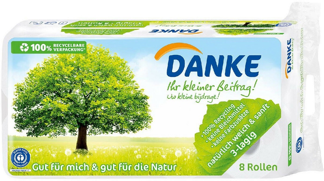 Toilettenpapier Danke 100% Recycling Tissue 3-lagig 8x150 Blatt keine Bleichmitt