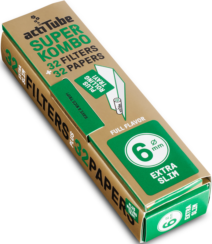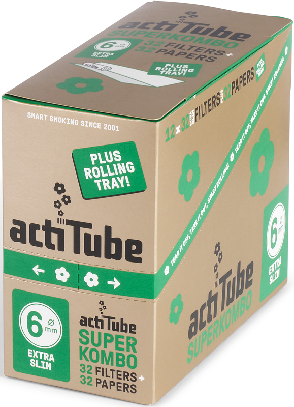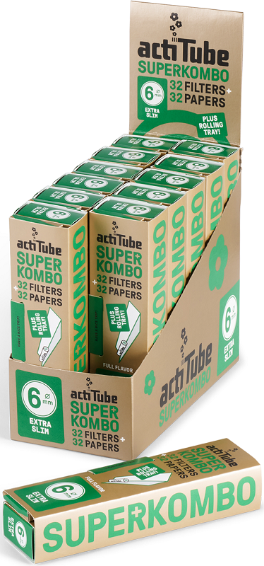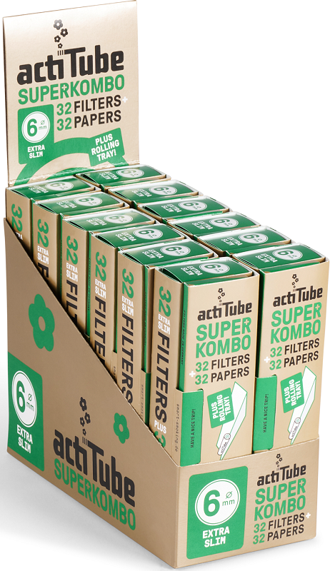 ACTITUBE Superkombo 6mm EXTRA SLIM Filters + Papes mit Rolling Tray, je Heftchen 32 Filter & 32 Papes im 12er T-Dsp.