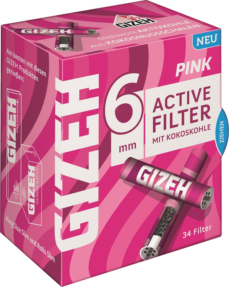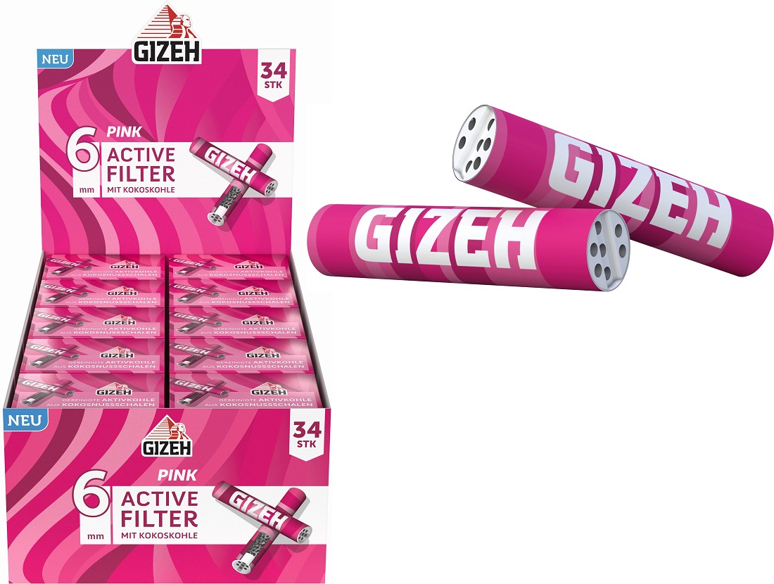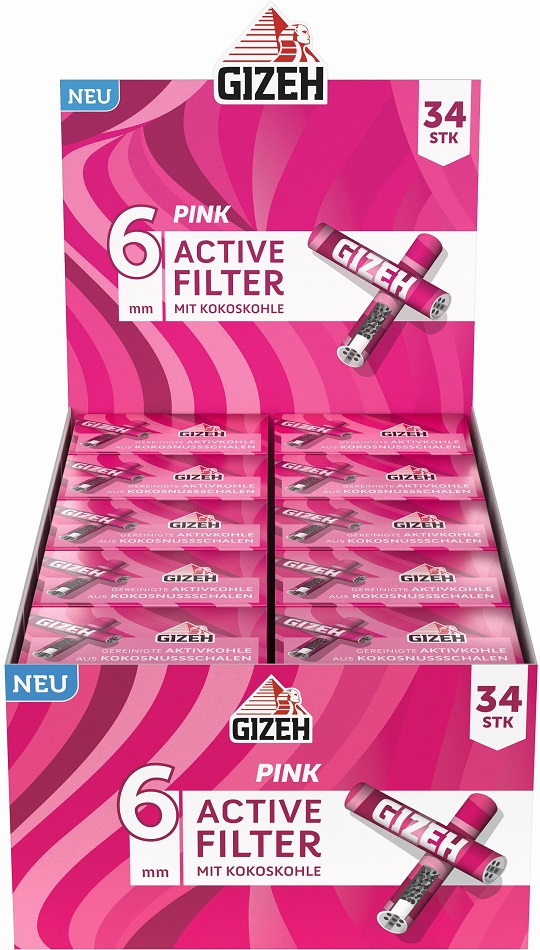 GIZEH PINK Active Slim Filter Kokoskohle 6mm aus Kokosnussschalen 34st.in Box 6x27mm 10 boxen im T-Dsp.