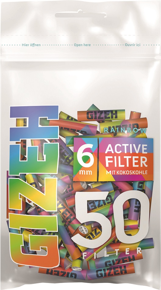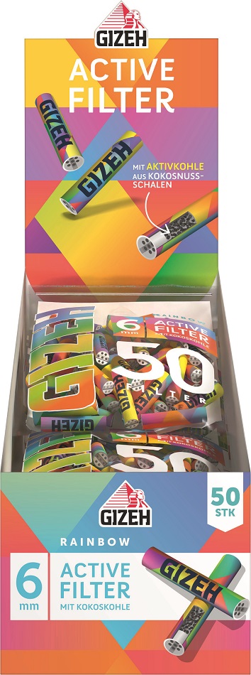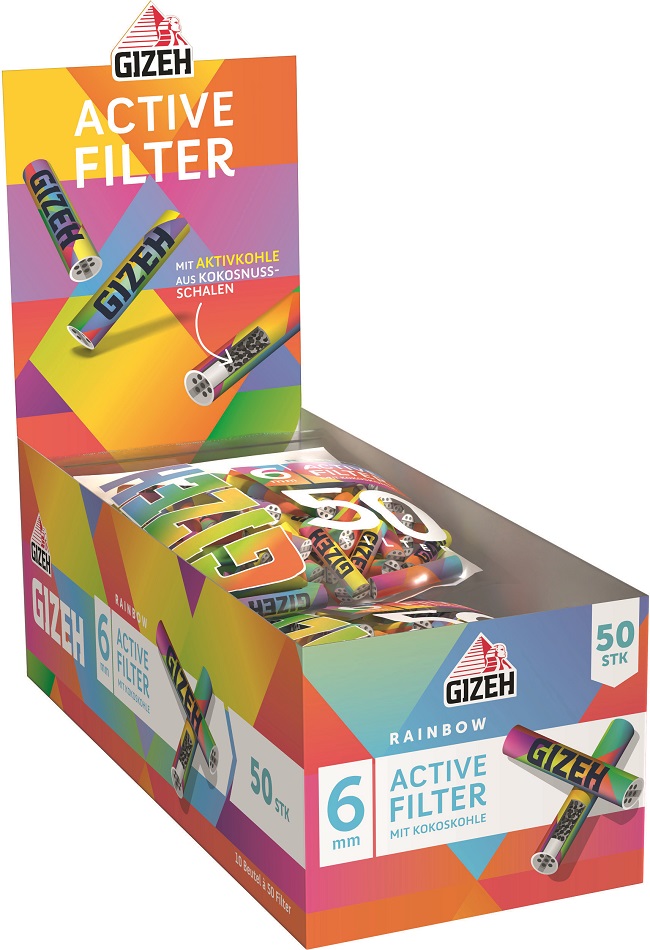 GIZEH RAINBOW Active Kohle-Filter Keramik-Kappen 6x27mm 50er Beutel im 10er T-Ds