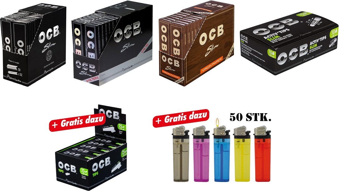 OCB - AKTIONSPAKET - 4 tlg. + GRATIS Filter Tips 25er Dsp. (90901) & Einweg Reibrad Fzg. transparent 50er Dsp. (90129) - je 1x: Slim Premium Long Papers (60094); Schwarz Premium Slim Papers mit Filter (90305); Unbleached Virgin Slim mit Tips (95427); Activ Tips Slim 7mm (99054)