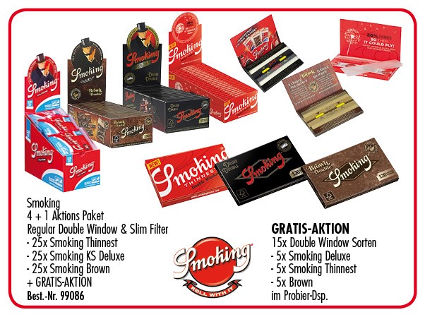 Smoking 4 + 1 Aktions Paket Regular Double Window&Slim Filter(96114)(25xSmoking Thinnest() / 25xSmoking Deluxe(96101) / 25xSmoking Brown() + AKTION 15xDOUBLE WINDOW sorten Probier T-Dsp.