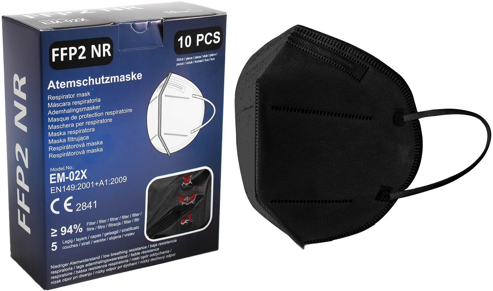 Mund-Nasen Maske FFP2 SCHWARZ 5-lagig EM-02X mit Ohrschlaufen Justierbarer Nasenbügel CE EN 149:2001+A1:2009 in 10er Verpackung