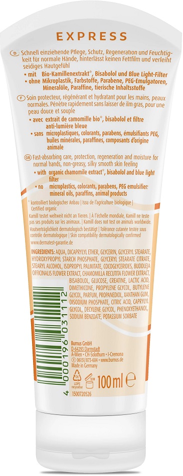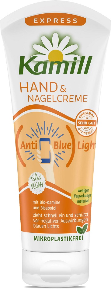 Kamill Hand&Nagel Express mit Bio-Kamille und Bisabolol, zieht schnell ein und schützt vor negativen Auswirkungen blauen Lichts in100ml Tube