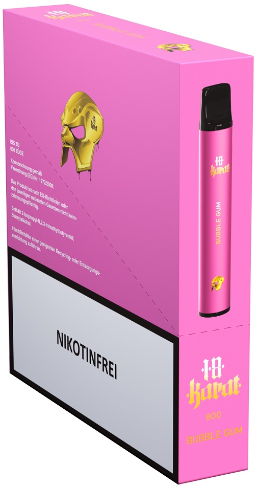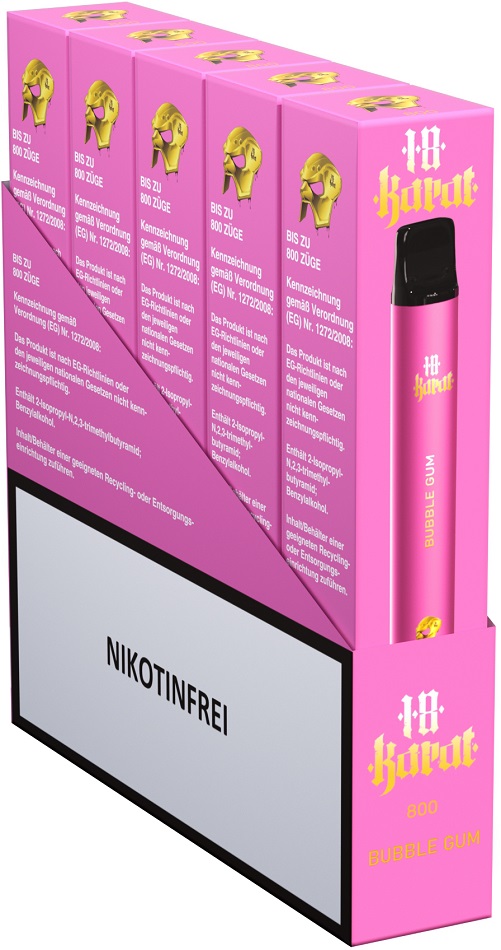 18 Karat E-Shisha BUBBLEGUM - NO Nikotin 0mg ca. 800 Züge 400mAh Einweg-Pos System TPD konform 5er T-Dsp.(mit Steuerbanderole)