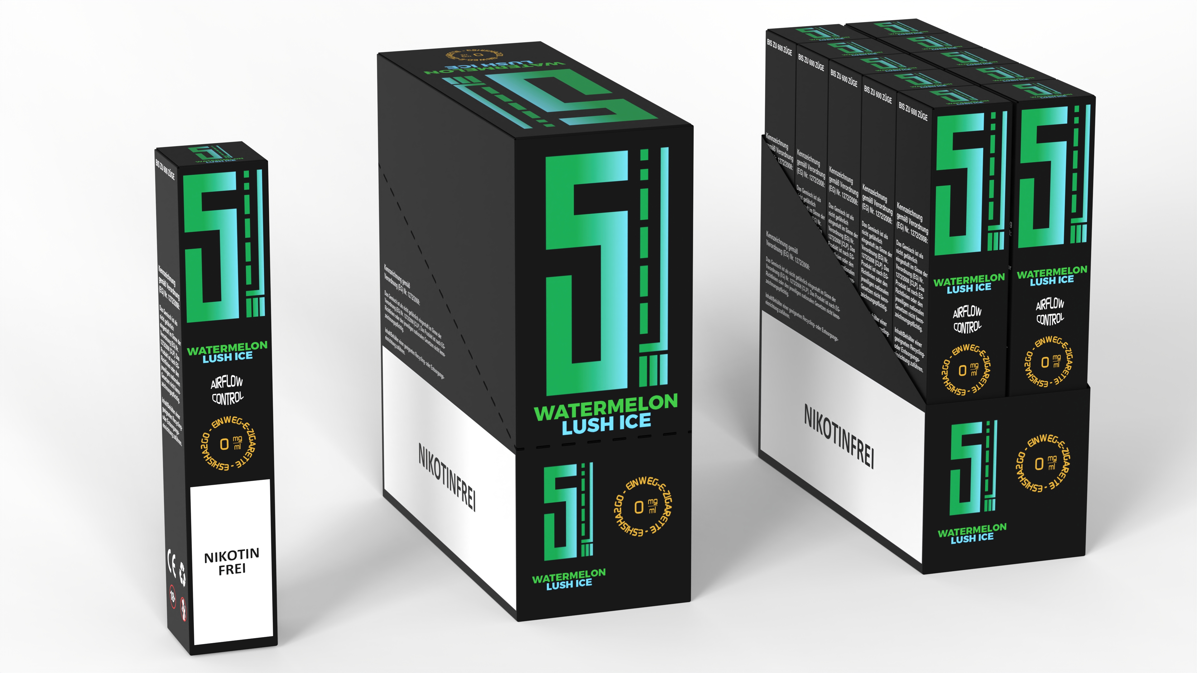 5EL E-Shisha WATERMELON LUSH ICE ca. 600 Züge - NO Nikotin 550mAh Einweg-Pos System TPD konform 10er T-Dsp.(mit Steuerbanderole)