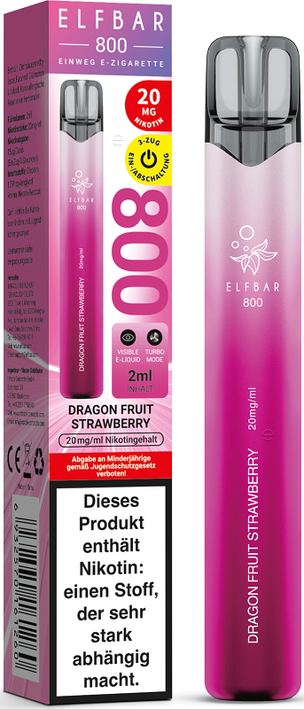 Elfbar 800 E-Shisha DRAGON FRUIT STRAWBERRY ca. 800 Züge - mit Turbo-Mode / sichtbarem Liquid / Kindersicherung, Nikotin 2ml Liquid Nikotin 20mg/ml 550mAh Einweg-Pos System TPD konform 10er T-Dsp.(mit Steuerbanderole)